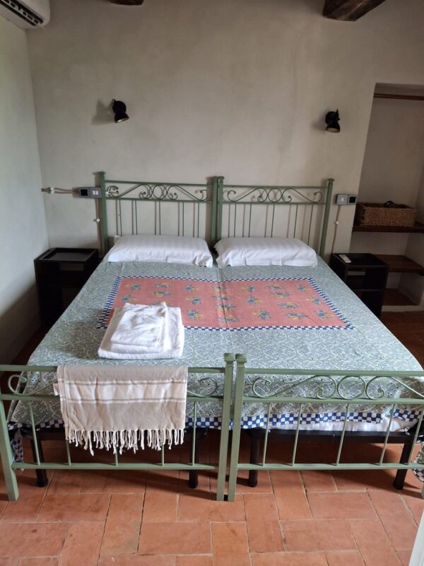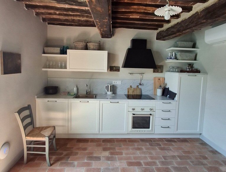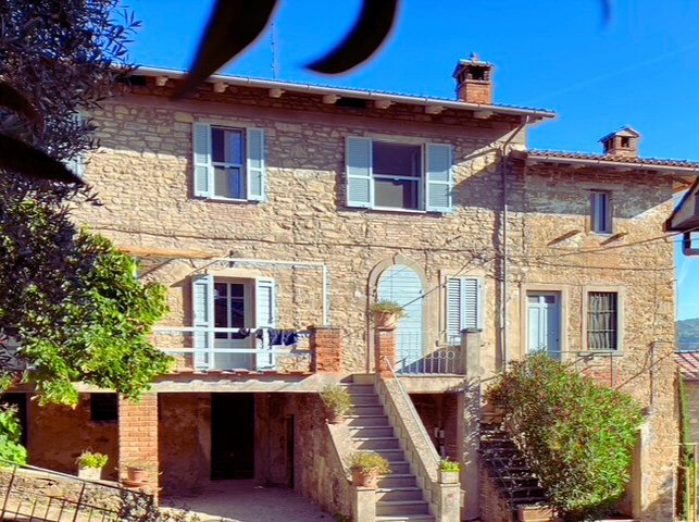 Das Erdgeschoss mit Blick auf eine schöne große private Terrasse zum Garten. Im Obergeschoss drei Doppelzimmer, eines davon mit Bad im Zimmer. Ein zweites Badezimmer im Stock.